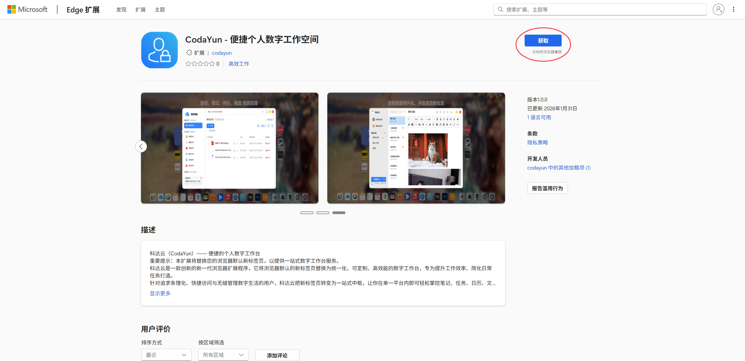 1、点击进入 Microsoft Edge 拓展商店,点击获取按钮