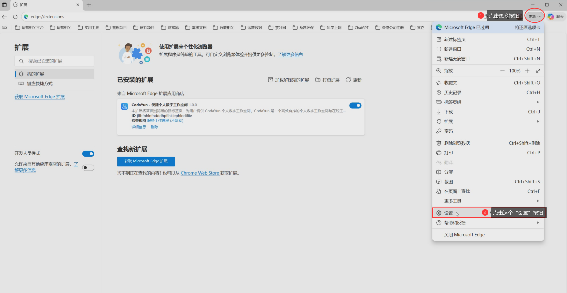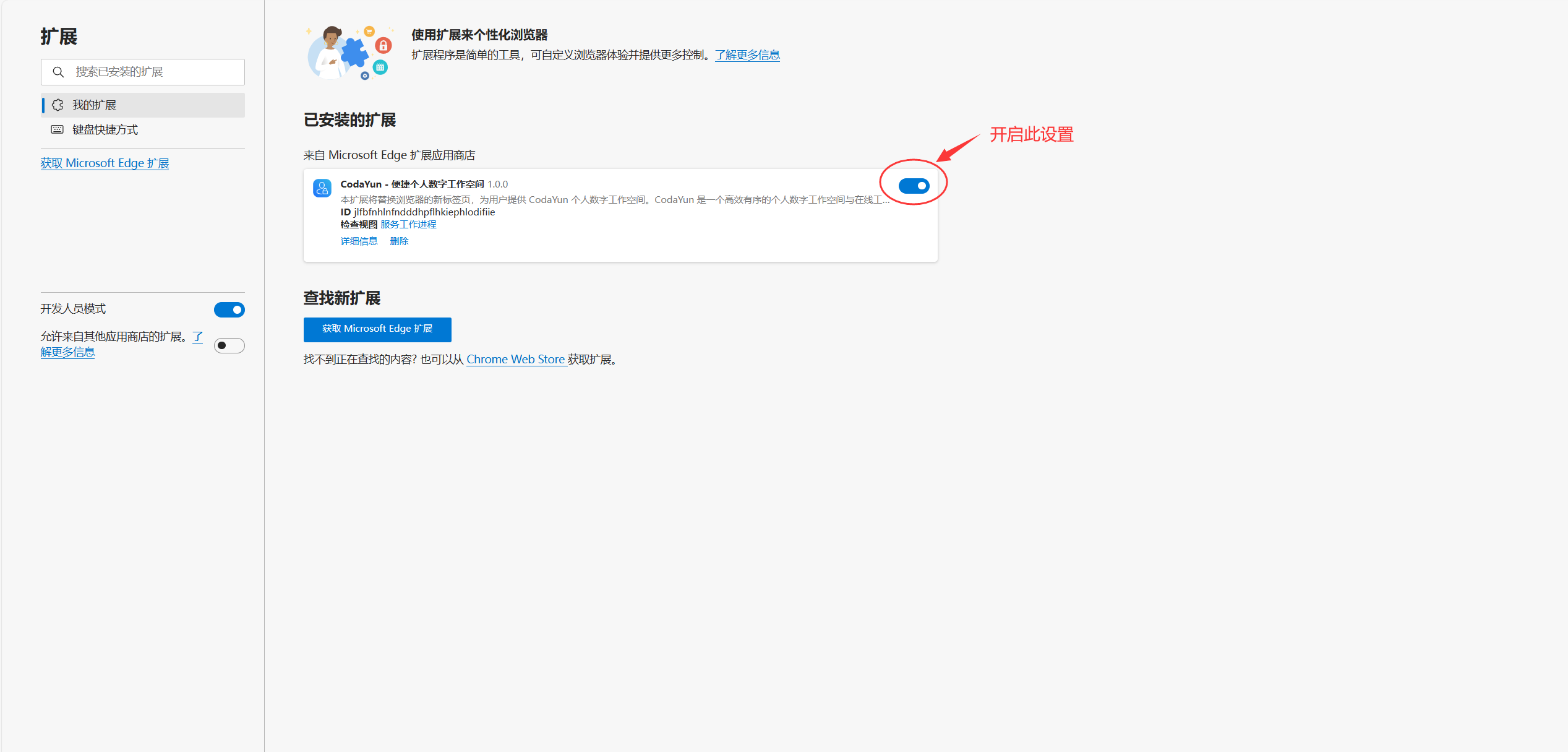 4、如没有出现确认弹框跳转到浏览器插件管理页面,可在浏览器导航栏输入edge://extensions/,进入插件管理页,然后再点击开启按钮启用 CodaYun 新标签页面