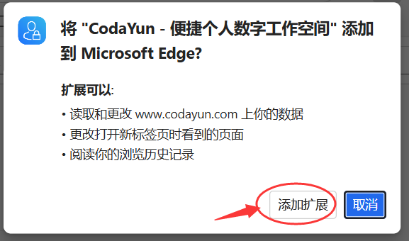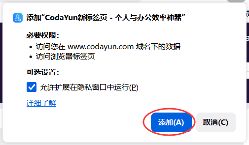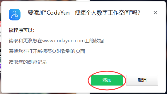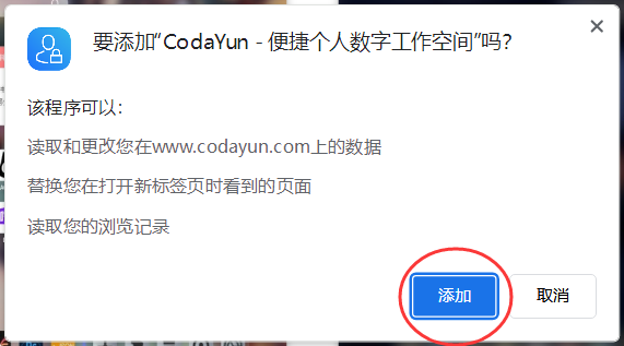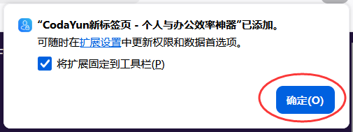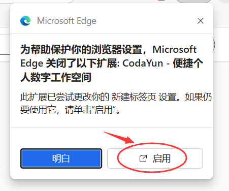 3、安装完成后,会出现确认弹框提示把CodaYun设置为 浏览器新建标签,点击“启用”按钮去设置 。如果没有自动弹出这个确认弹框,可按 步骤4 的教程手动设置。