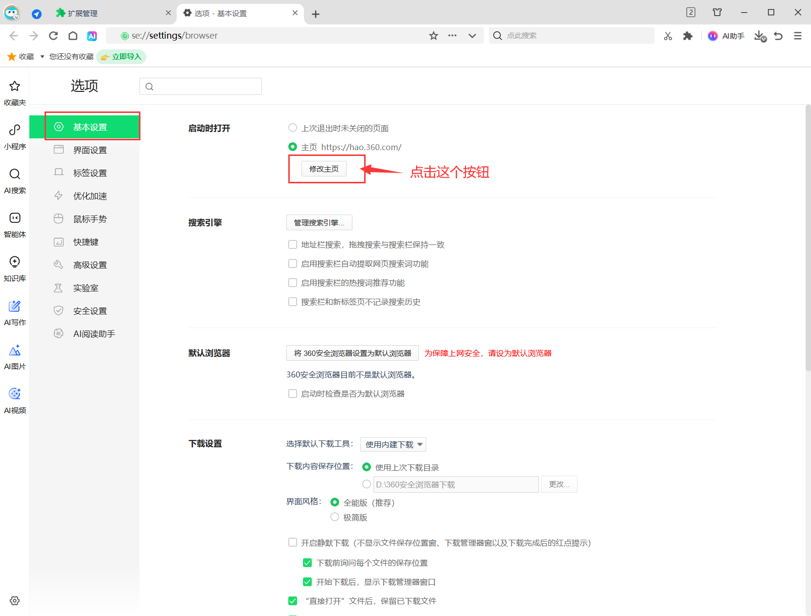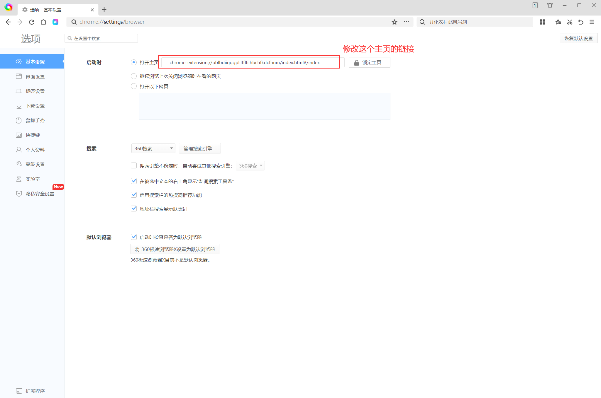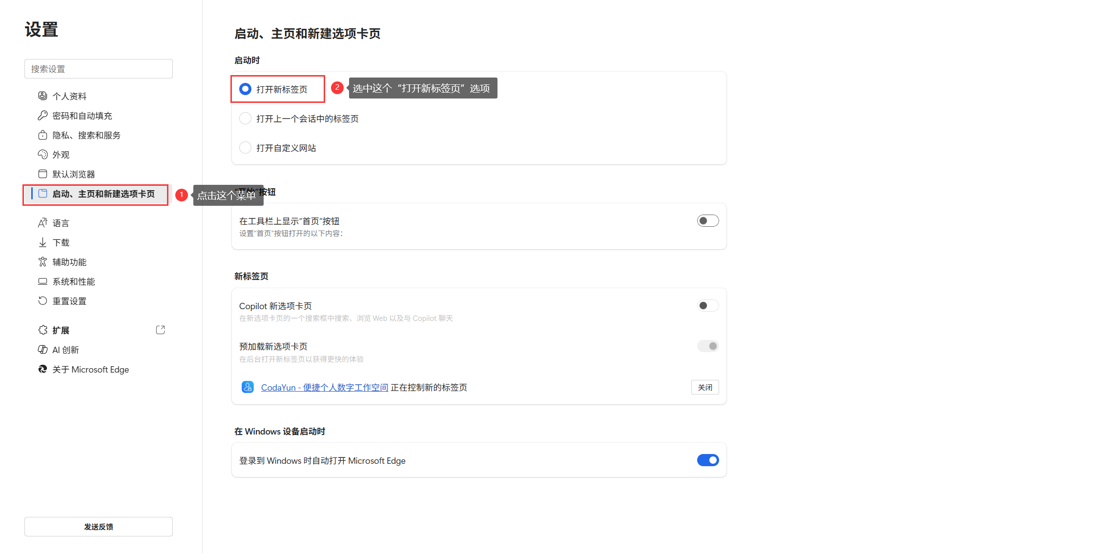点击 启动、主页和新建标签页,将 打开新标签页 按钮开启