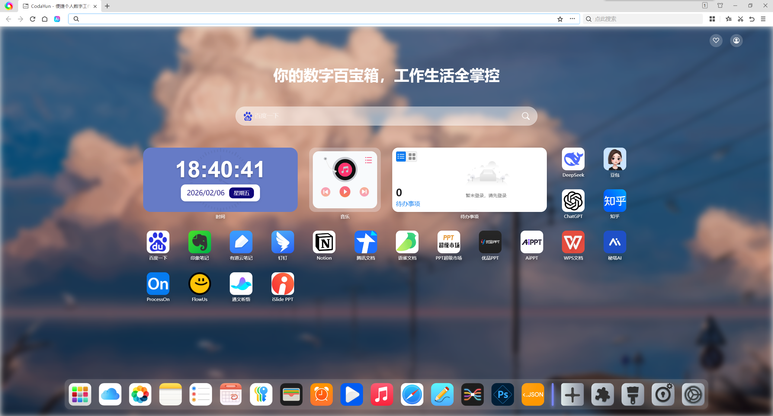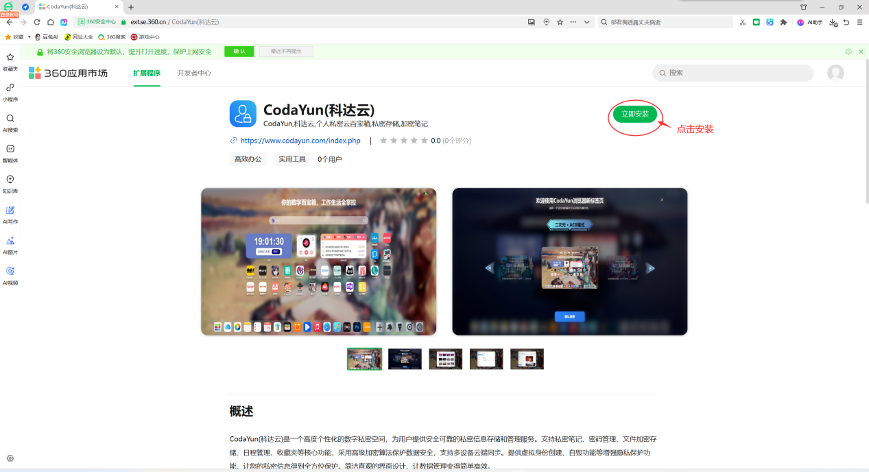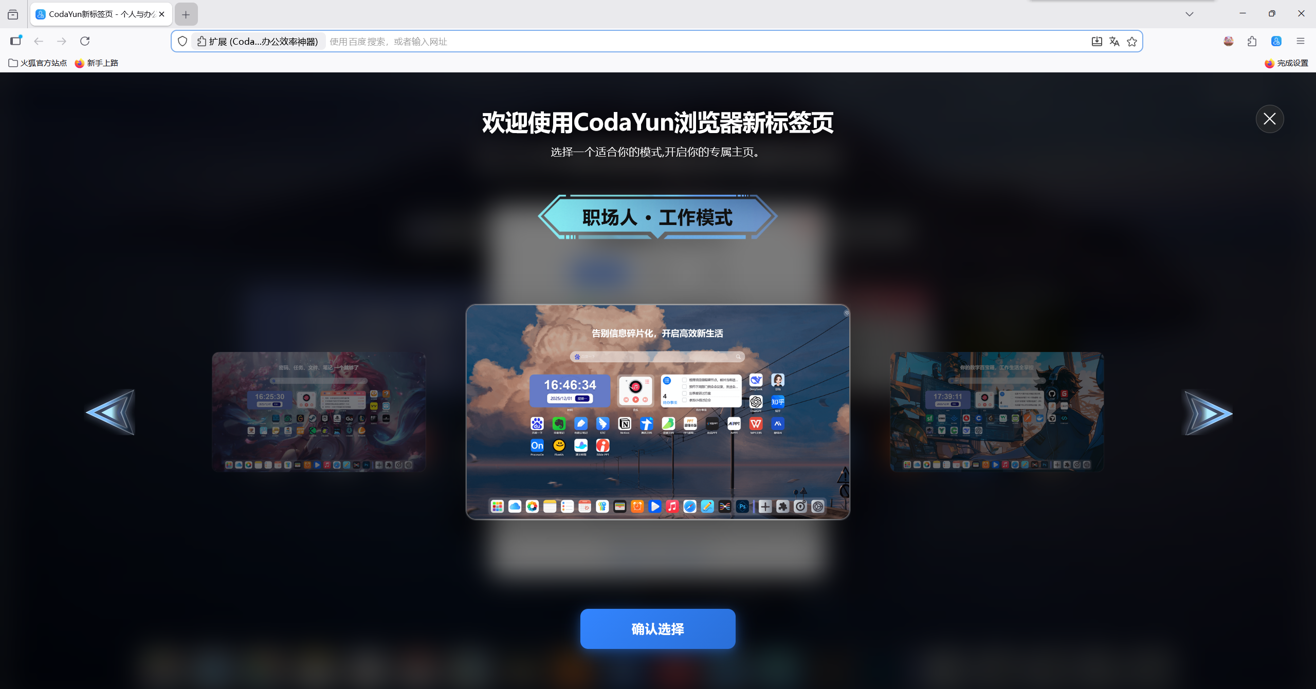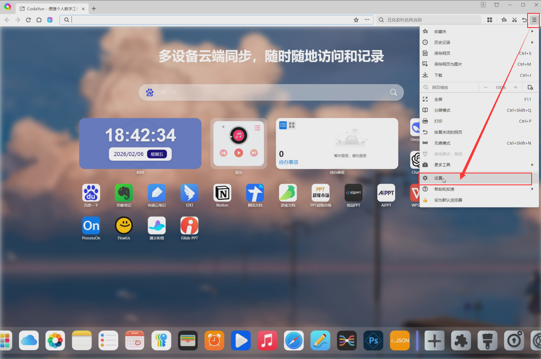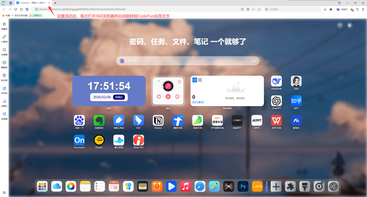 5、如果您进入浏览器展示的不是CodaYun 新标签页,可选择设置 CodaYun新标签页 为起始页,具体操作步骤如下: