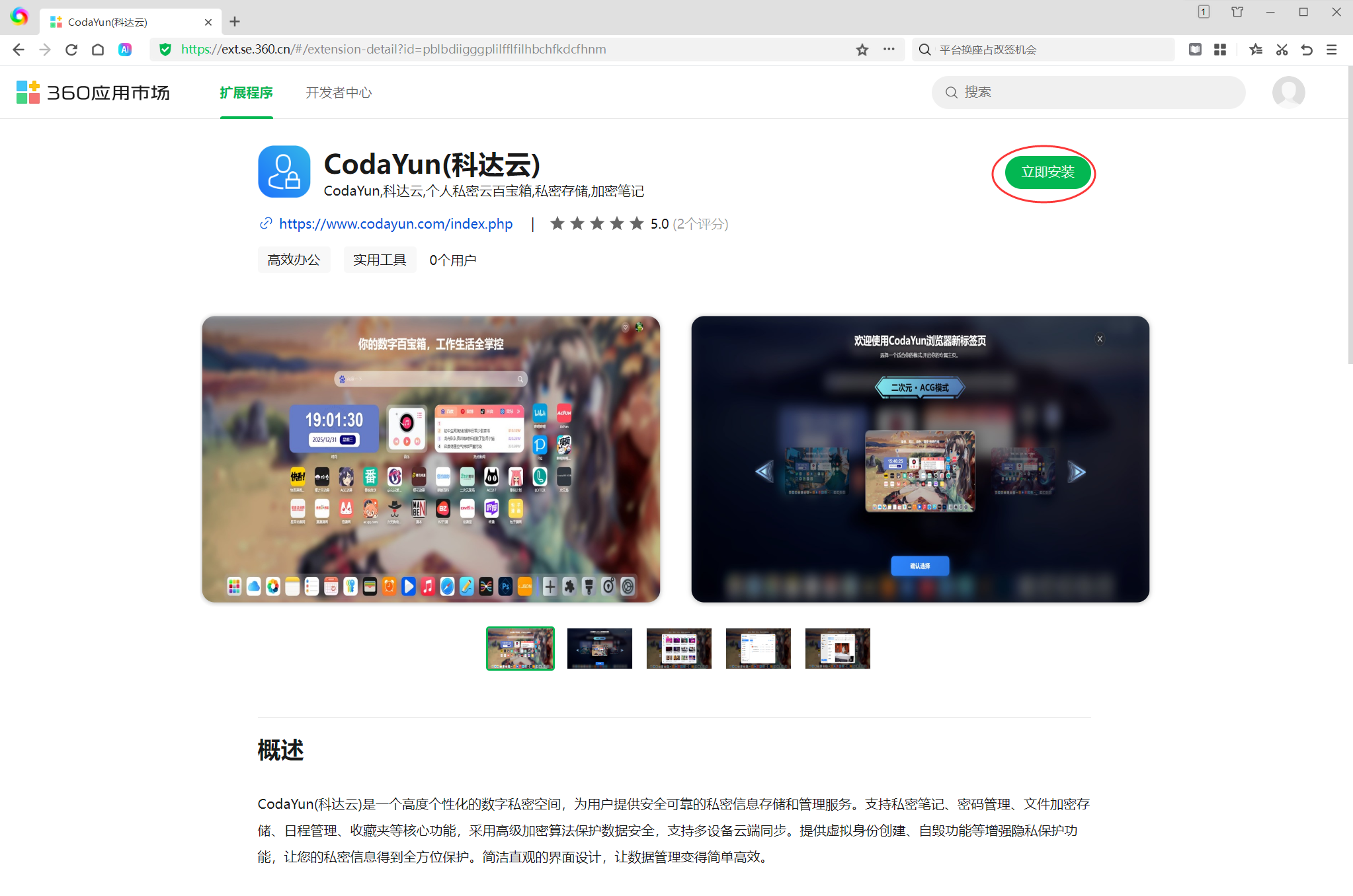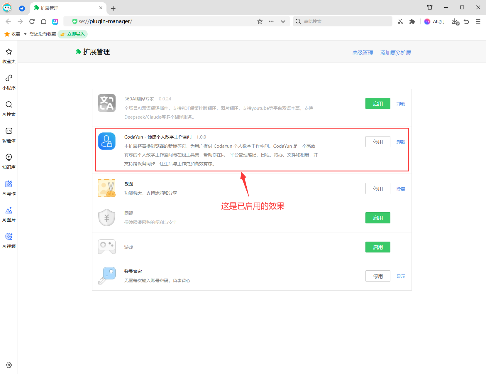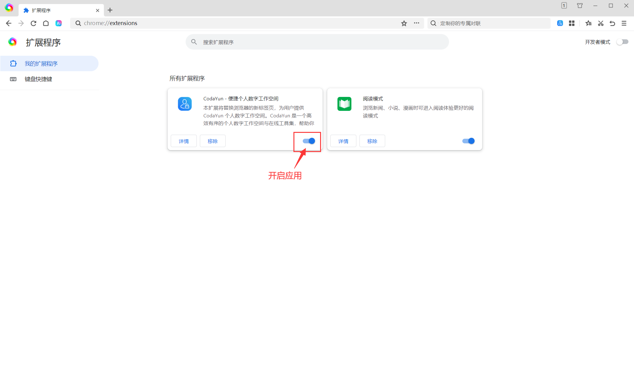 点击“启用”后,会自动跳转到浏览器扩展管理页面,在此页面中,找到CodaYun插件,开启插件应用。